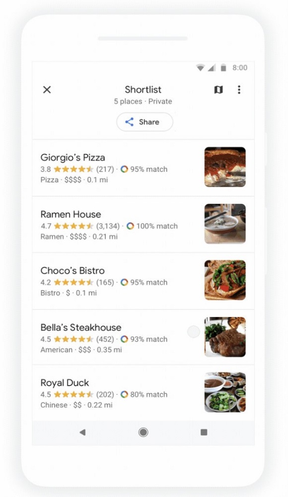 Setelah kamu menambahkan tempat, kamu dapat dengan cepat membagikan daftar itu dengan teman-teman kamu di aplikasi pesan, menambah atau menghapus tempat tambahan, dan memilih bersama di Google Maps.
